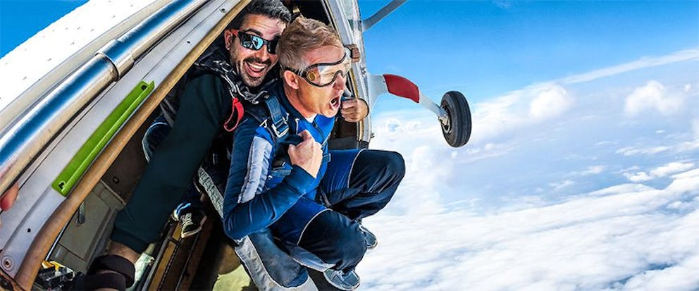 Augenblicke für die Ewigkeit! Fest verbunden mit einem erfahrenen Tandem-Master springst du aus einer Höhe von rund 3.000 bis 4.000 Metern ins Nichts. Nach deinem Exit beschleunigst du wie ein wild gewordener Sportwagen, bis du mit Freifallgeschwindigkeit der Erde entgegen rast. Etwa 50 Sekunden später zieht dein Tandem-Master die Reißleine und du gleitest am Schirm durch die Luft! Ein Fallschirm-Tandemsprung mit freiem Fall raubt dir das Zeitgefühl: Die Sekunden fühlen sich an wie eine Ewigkeit!